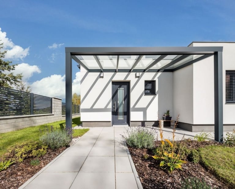 Die Pergola mit Glasdach ist unsere meistverkaufte verglaste Pergola. Die Dachkonstruktion aus Sicherheitsglas in klarer oder satinierter Ausführung bietet zuverlässigen Regenschutz – auch für große Terrassenflächen.