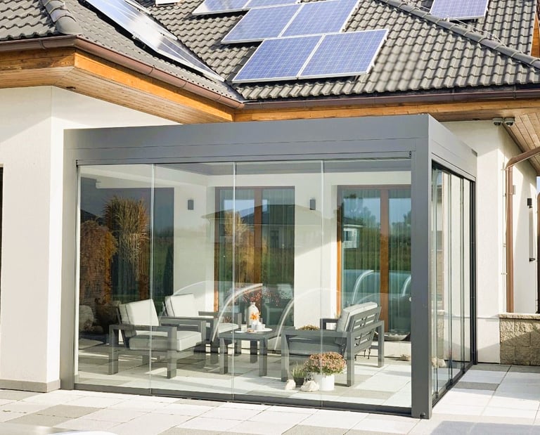 Die Seitenwände sind elegant verglast und können entweder als feste Verglasung oder als praktische Schiebesysteme ausgeführt werden, sodass sich der gesamte Raum flexibel öffnen oder schließen lässt.