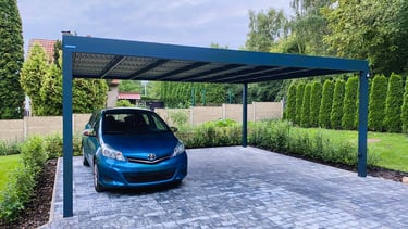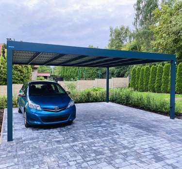 Robuster, moderner Carport aus Aluminium mit Flachdach und integriertem Wasserablauf – zuverlässiger Wetterschutz für ein oder zwei Fahrzeuge.