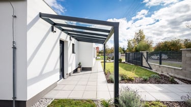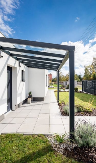 Elegante und transparente Überdachung mit hochwertigem Sicherheitsglas. Maximale Lichtdurchlässigkeit bei gleichzeitig zuverlässigem Wetterschutz.