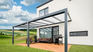 Unsere meistverkaufte verglaste Pergola mit Sicherheitsglasdach in klarem oder Milchglas-Design. Die stabile Aluminiumkonstruktion bietet zuverlässigen Wetter- und Regenschutz für große Terrassenflächen.