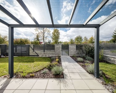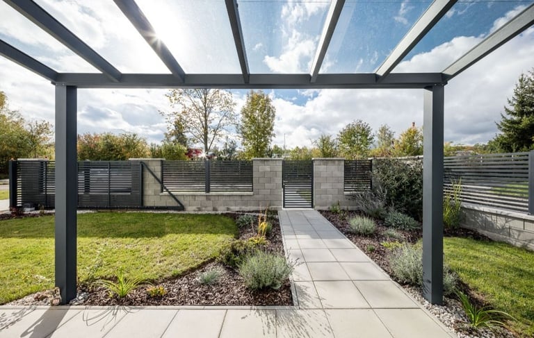 Die Pergola mit Glasdach ist unsere meistverkaufte verglaste Pergola. Die Dachkonstruktion aus Sicherheitsglas in klarer oder satinierter Ausführung bietet zuverlässigen Regenschutz – auch für große Terrassenflächen.