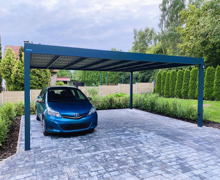 Robuster und moderner Carport aus hochwertiger Aluminiumkonstruktion mit Flachdach und integriertem Wasserablauf. Bietet zuverlässigen Wetterschutz für ein oder zwei Fahrzeuge und überzeugt durch Langlebigkeit sowie zeitloses Design.