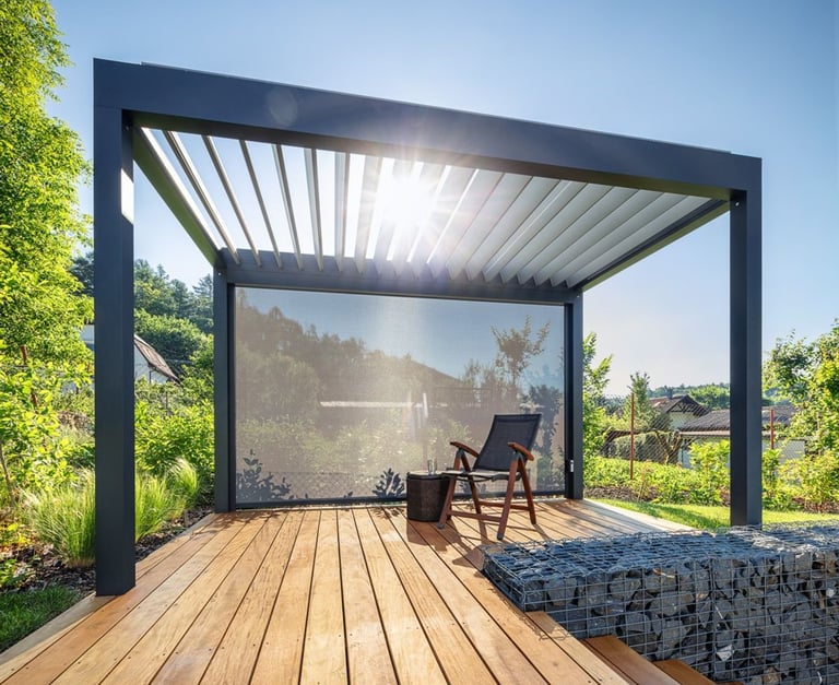Intelligente Lösung mit verstellbaren Lamellen für optimale Belüftung, effektiven Sonnenschutz und zuverlässigen Wetterschutz. Ideal für die ganzjährige Nutzung im Außenbereich.