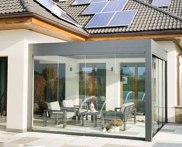 Die Seitenwände sind elegant verglast und können entweder als feste Verglasung oder als praktische Schiebesysteme ausgeführt werden, sodass sich der gesamte Raum flexibel öffnen oder schließen lässt.